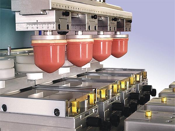 a.平動壓印式。移印膠頭蘸取油墨后移動到印刷位置,印版上的圖文與承印物上的圖文距離相等,膠頭的每次移動行程等距。
